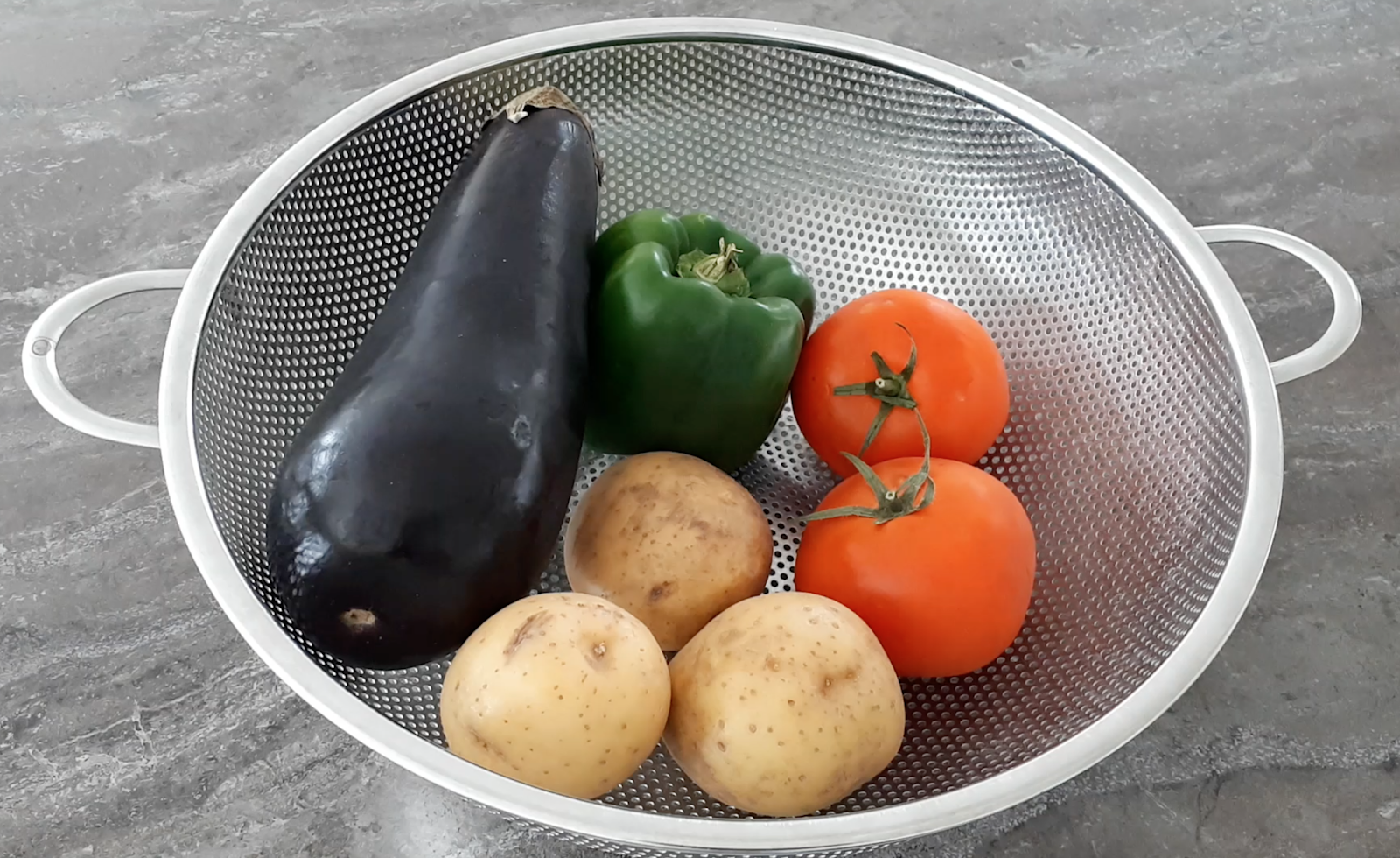 - Fritar a berinjela, batata e pimentão, um de cada vez no um pouco (uma colher de sopa) de óleo numa frigideira. Coloque um pouco de sal em cada. Frite até que está cozido.